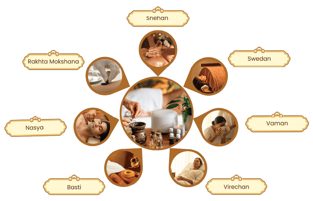 Panchakarma procedures like Vamana, Virechana, Basti, Raktamokshana, Nasya, Shirodhara etc.